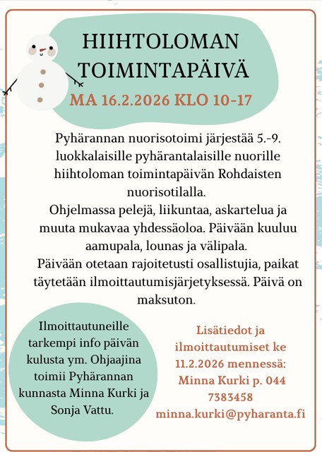 Tietoa tulevista kunnan tapahtumista ja kokouksista. Jos haluat yhdistyksen tapahtumat kalenteriin, ilmoita tiedot: kunta@pyharanta.fi (voit katsoa menovinkkejä myös uusimmasta Uutisankkurista).