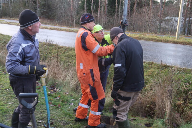 Tolpan asennus on vatupassin tarkkaa puuhaa. Rantatien varteen Reilan koulun risteyksen lähelle taulua pystyttivät Ossi Siivonen (vas.) Markku Laine, Tapio Uusitalo ja Seppo Mannervesi.